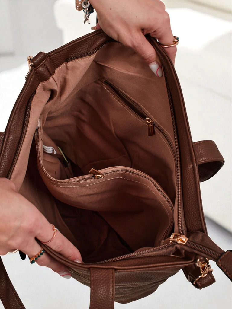 Privalumai ir pojūčiai naudojant: Šis rankinės modelis sujungia praktiškumą su klasikiniu dizainu. Didelis vidus (aukštis 34 cm, plotis 27 cm, gylis 14 cm) talpina A4 formato dokumentus, planšetinį kompiuterį ir kasdienius reikmenis. Standžios 26 cm ilgio rankenos ir nuimamas reguliuojamas dirželis užtikrina patogų nešiojimą ant peties arba kaip „crossbody“. Užtrauktukas garantuoja turinio saugumą, o vidinės kišenės su užtrauktuku ir kišenės telefonui padeda organizuoti daiktus. Rankinė yra minkšta, bet struktūriška – suteikia tvirtumo ir elegancijos įspūdį.