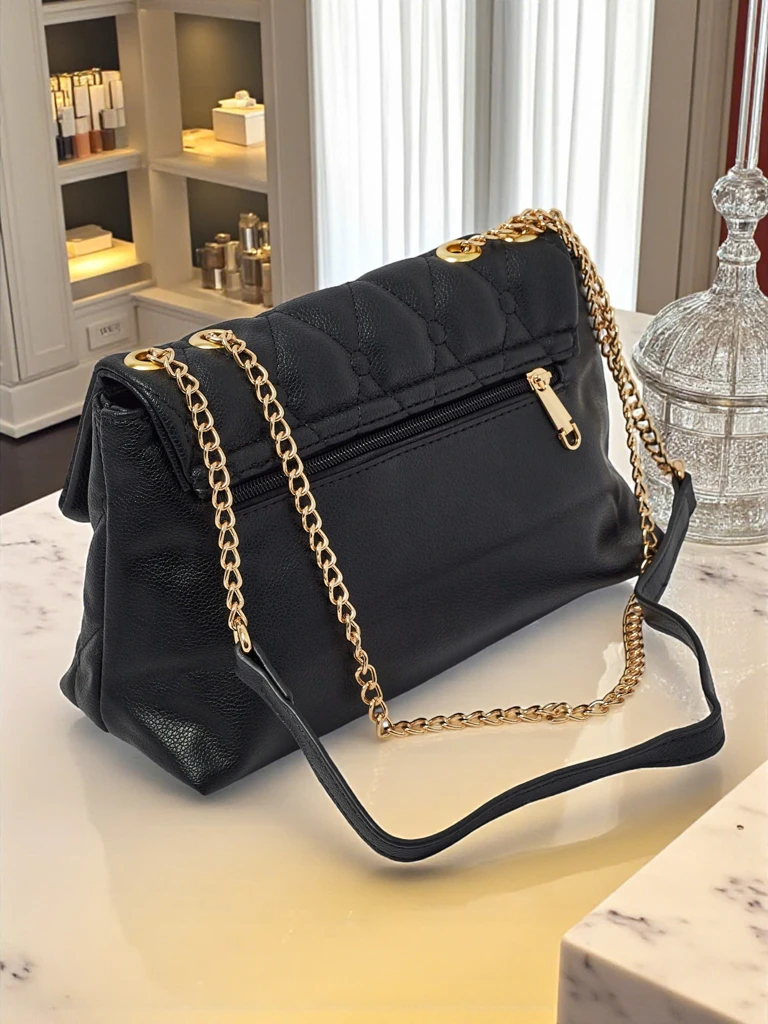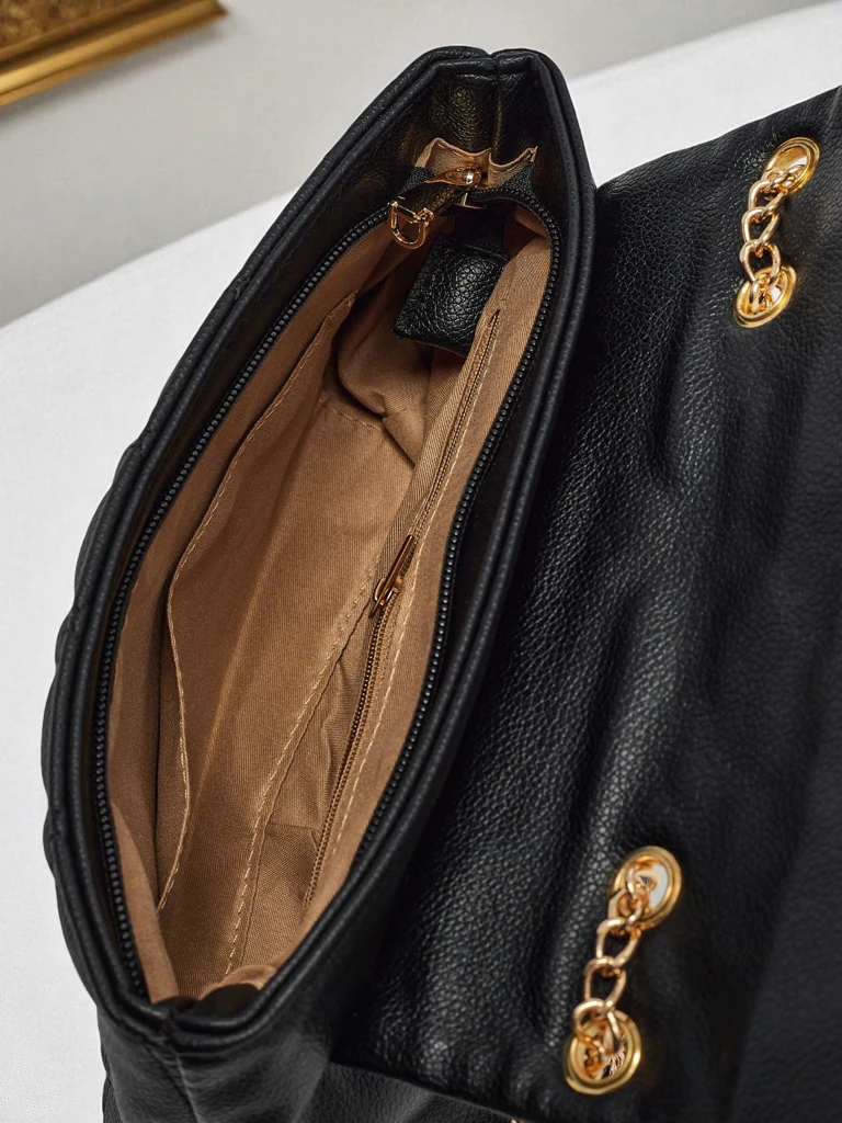 - Juoda moteriška rankinė „Frost Ember“ iš minkštos ekologiškos odos, auksinė grandinėlė, stilinga ir dygsniuota – puikiai tinka bet kokiai progai.