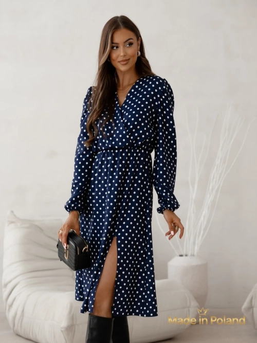 Calista Navy Polka Dot suknelė – tai klasika ir laikui nepavaldi idėja, kuri į jūsų garderobą įneš itališko stiliaus. Modelis pasiūtas iš aukštos kokybės, sertifikuotos viskozės – medžiagos, žinomos dėl savo laidumo orui, minkštumo ir lengvo blizgesio. OEKO-TEX® viskozė užtikrina komfortą odai ir tinkamą oro cirkuliaciją, sumažindama alergijos riziką. Dėl kruopštaus siuvimo ir modernios spausdinimo technologijos balti taškeliai išlieka intensyvūs ir patvarūs net po daugelio skalbimų.