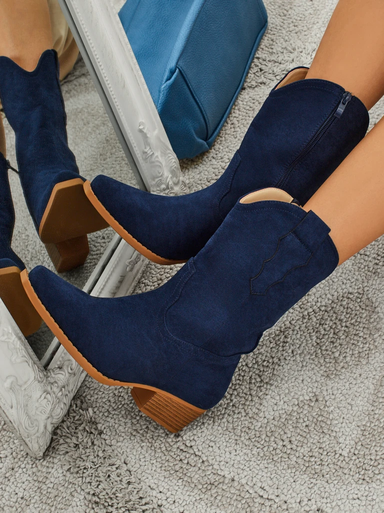 - Aulinukai a'la kaubojiški batai plokščiu kulnu, pagaminti iš zomšos ekologiškos odos. Tekstilinis vidpadis, batai užsegami užtrauktuku. Tinka prie daugelio moteriškų stilių!