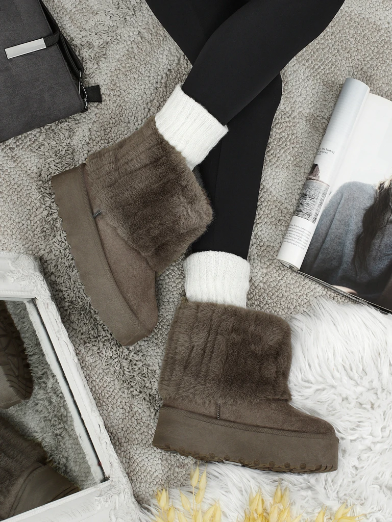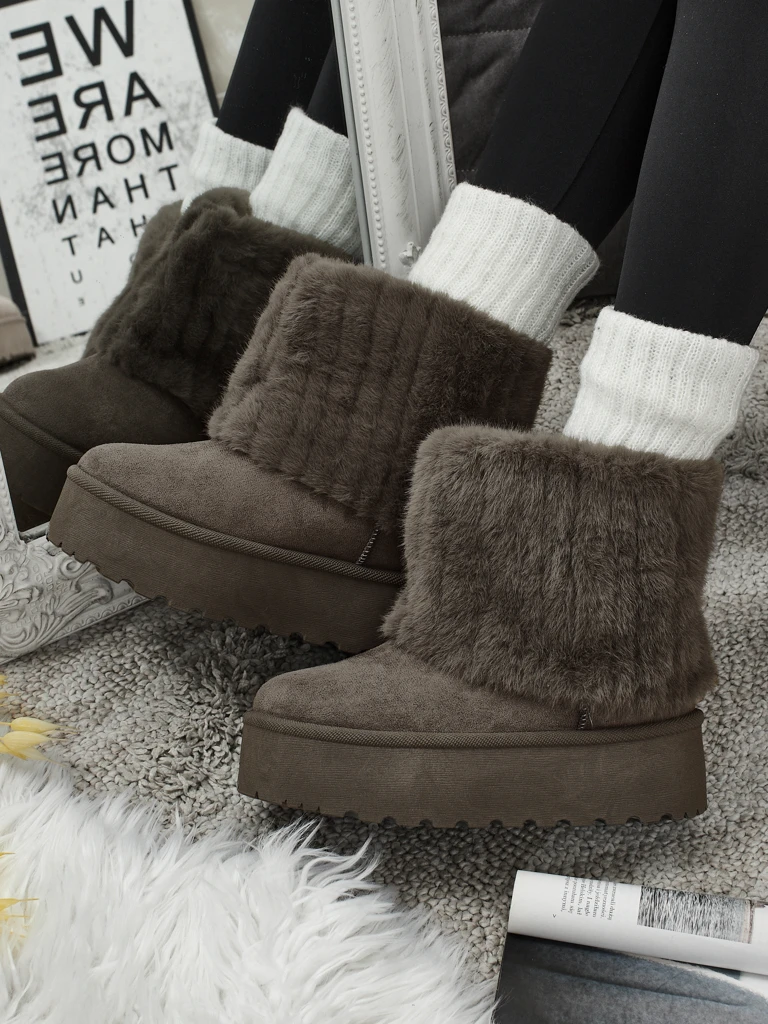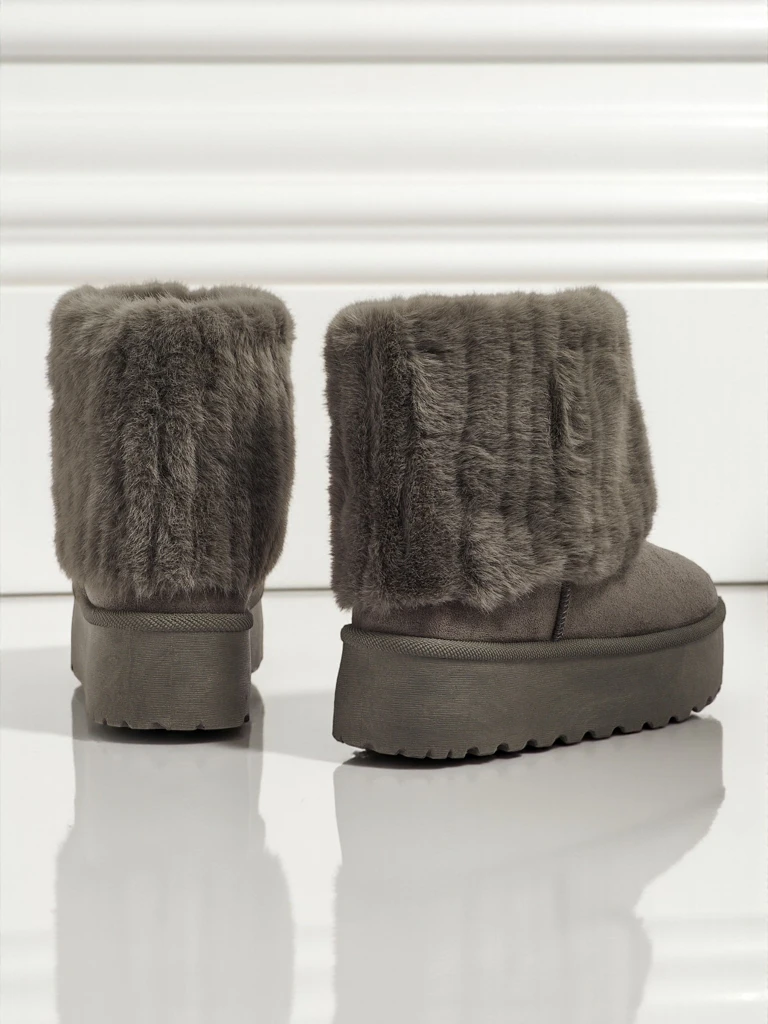 - Puikūs moteriški žieminiai sniego batai su storesniu platforminiu padu. Viršutinė dalis pagaminta iš ekologiškos zomšos odos, vidus apšiltintas kailiuku. Ideali bazė žiemai!
