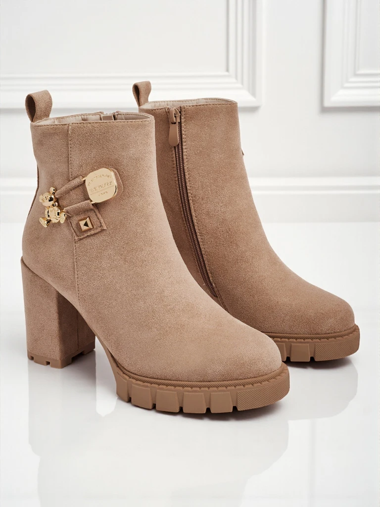 - Patogūs aulinukai su storu kulnu, pagaminti iš eko zomšos. Modelis užsegamas užtrauktuku. Modelis švelniai apšiltintas kailiuku, turi auksinę dekoraciją bato aulo šone. Puikus pasirinkimas rudeniui!