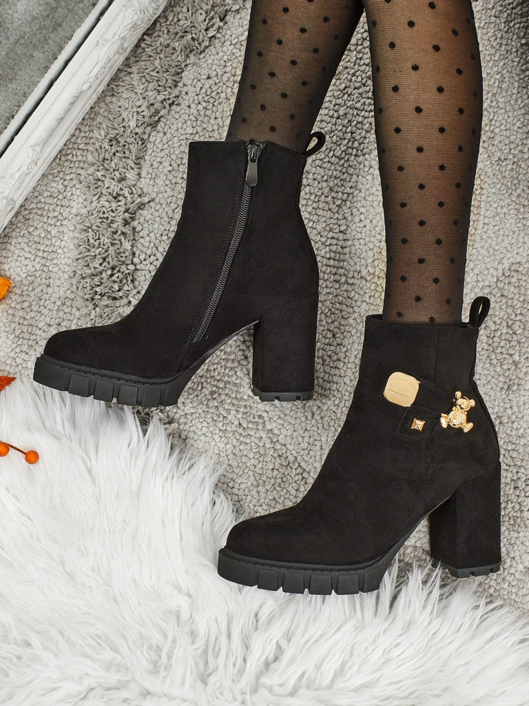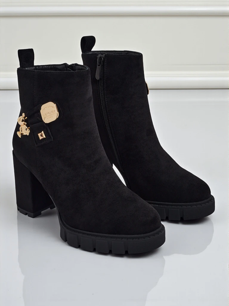 - Patogūs aulinukai su storu kulnu, pagaminti iš eko zomšos. Modelis užsegamas užtrauktuku. Modelis švelniai apšiltintas kailiuku, turi auksinę dekoraciją bato aulo šone. Puikus pasirinkimas rudeniui!