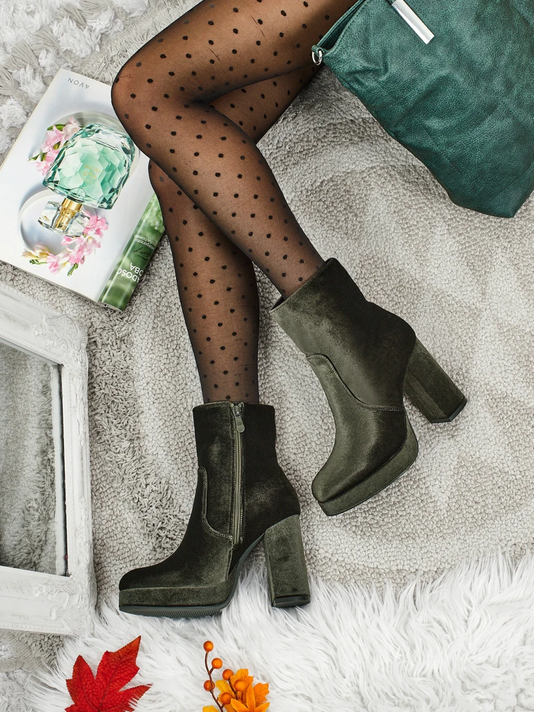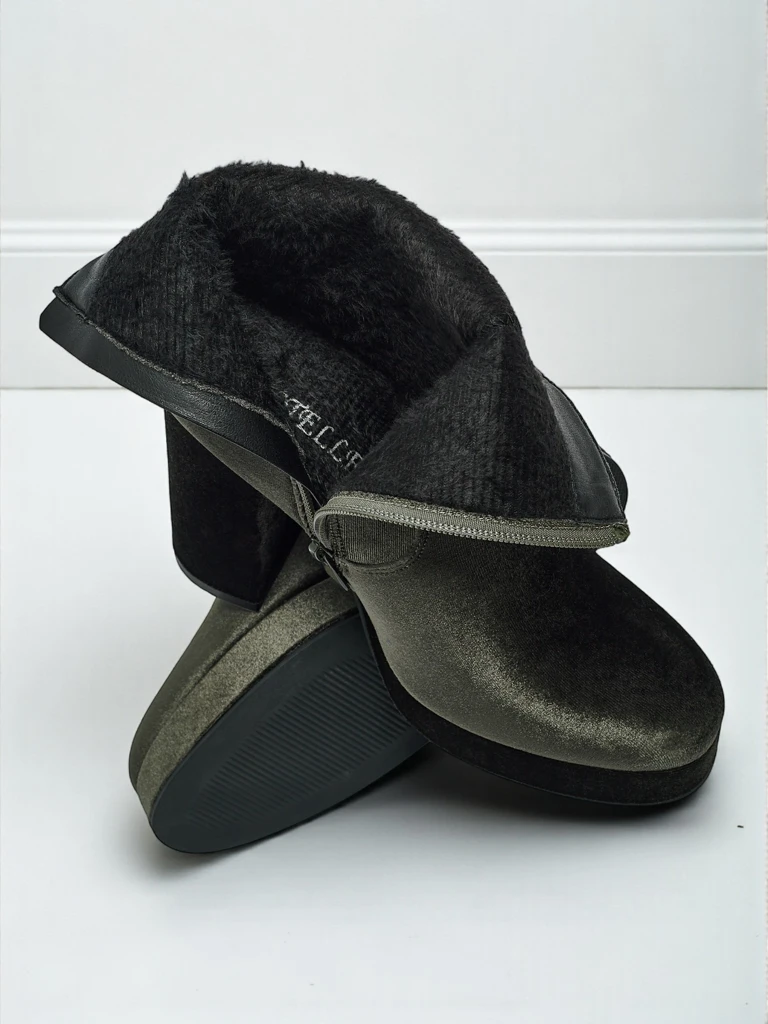 - Patogūs aulinukai su storu kulnu, pagaminti iš veliūrą primenančio audinio. Modelis užsegamas užtrauktuku. Turi švelnų pašiltinimą kailio pavidalu. Puikus pasirinkimas rudeniui!