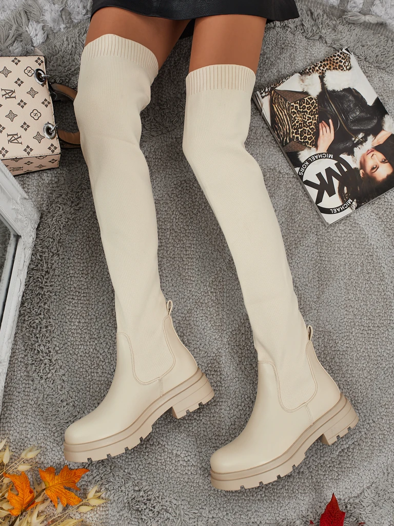 - Stilingi moteriški ilgaauliai virš kelių su plokščiu kulnu. Aulas pagamintas iš elastingo audinio su eko odos intarpais, viduje - medžiaginė įklotė. Modelis užtraukiamas. Puikiai tinka kasdieniams rudens deriniams!