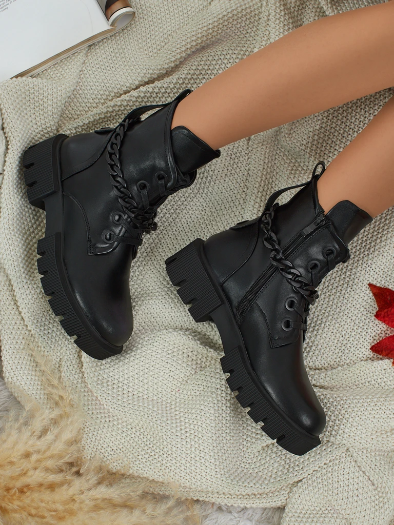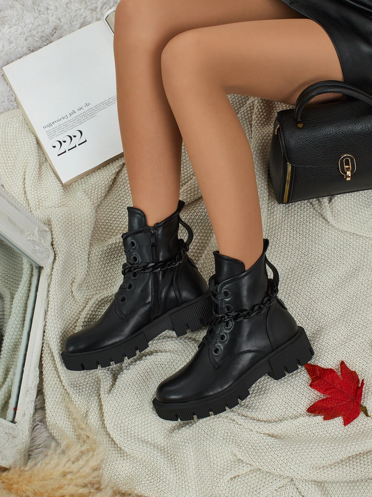 - Moteriški aulinukai iš eko odos su užtrauktuku, dekoratyvine grandinėle ir apvalia nosimi, papildomai apšiltinti kailiuku – modernumas, patogumas ir stilius viename.