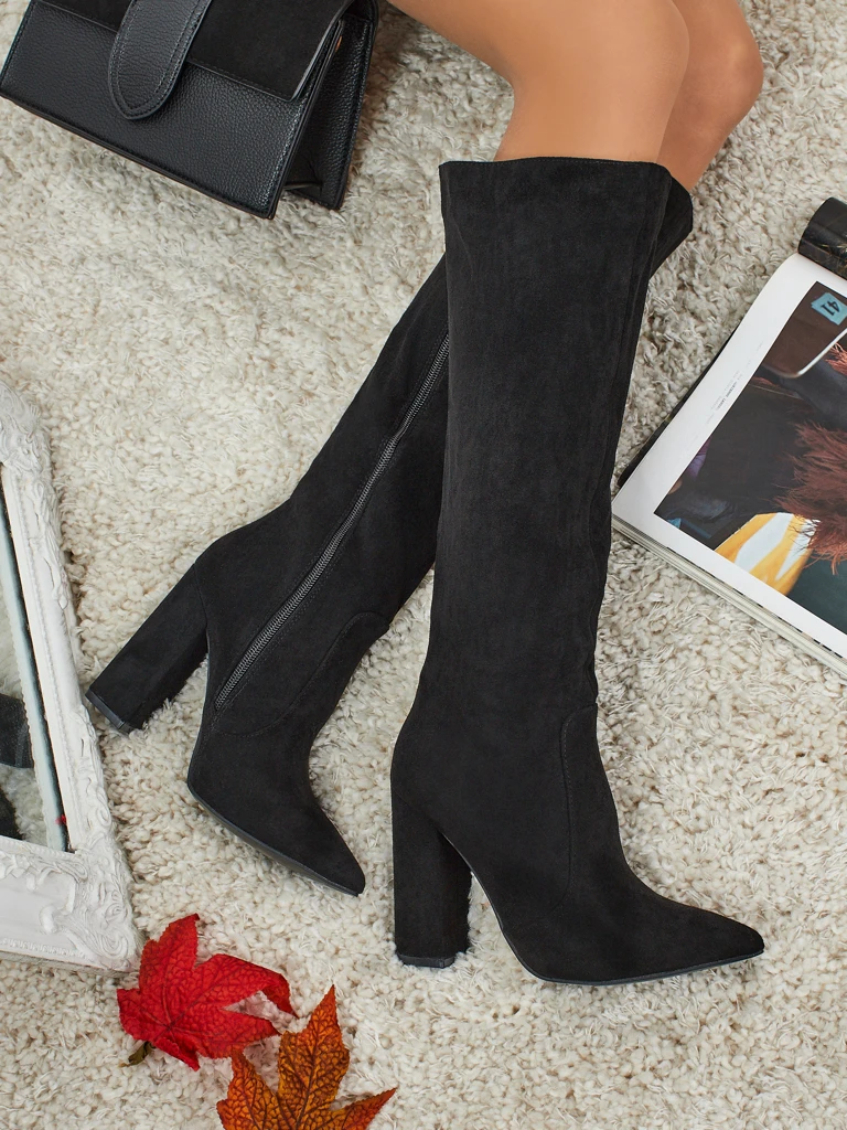 • Stilingi moteriški auliniai batai iki kelių su storu kulnu ir smailia nosele. Aulas pagamintas iš eko zomšos, viduje - švelnus kailis. Modelis užsegamas užtrauktuku. Puikiai tinka kasdieniams rudens deriniams!