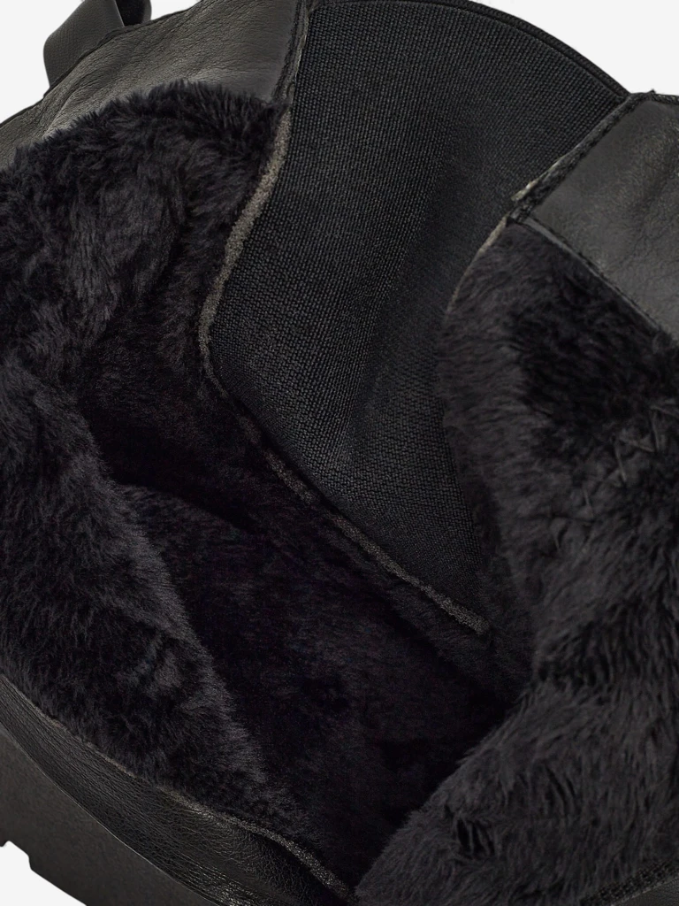 4. Look miejski: botki Luna + czarne spodnie + oversize’owy sweter + skórzana kurtka – doskonałe na wieczorne wyjście.