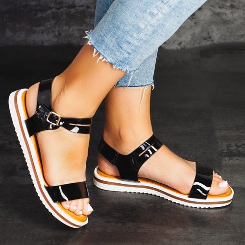 - Klasyczne sandały na grubej podeszwie zapinane na sprzączkę po zewnętrznej stronie. Materiał wykonania obuwia to eko-skóra w kolorze czarnym. Wkładka jest pokryta eko-skórą. Wygodne oraz starannie wykonane. Idealnie sprawdzą się na cieplejsze dni.