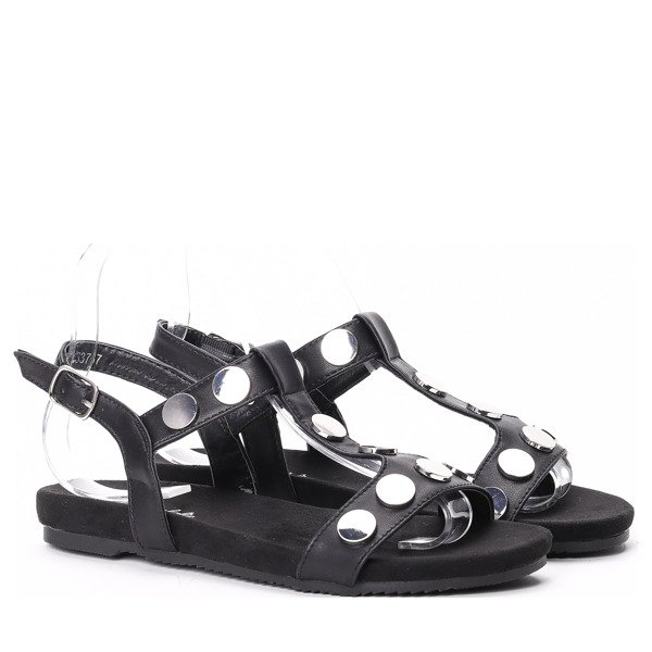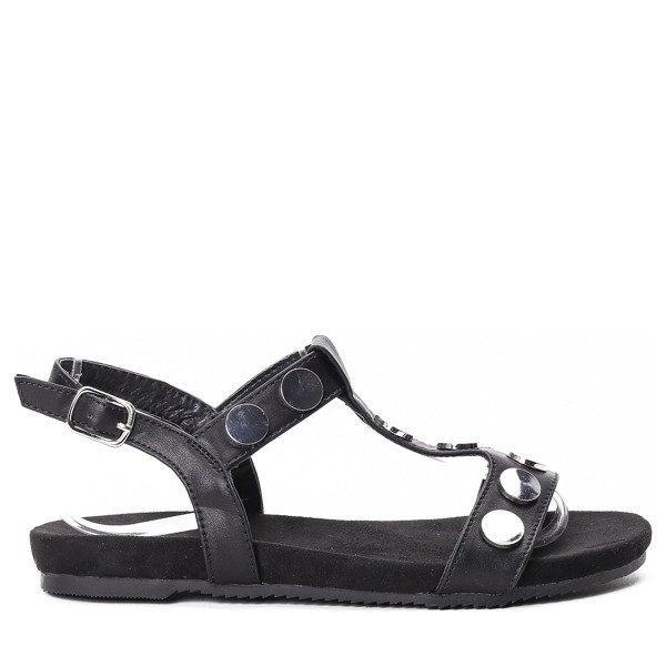 - Sandały na płaskiej podeszwie wykonane z ekologicznej skóry. Ozdobione metalowymi kółeczkami. Obuwie zapinane na sprzączkę z boku. Idealnie nadadzą się do każdej letniej stylizacji!