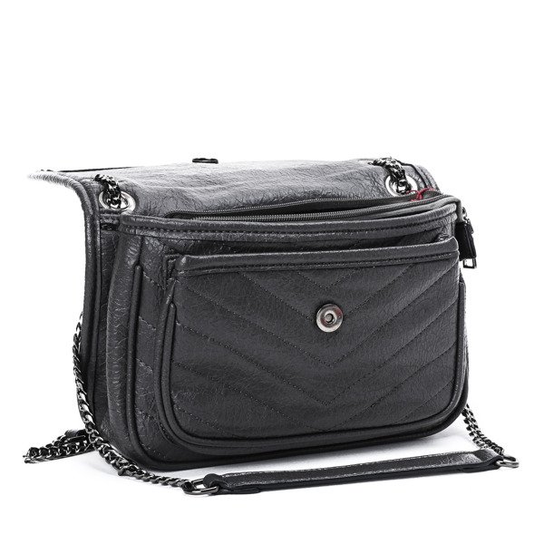 • Маленькая серая сумочка из экологической кожи с декоративным плечевым ремнем в виде цепочки. Сумка застегивается на магнитную пуговицу и молнию. В представленной модели 4 кармана, в том числе один на молнии.