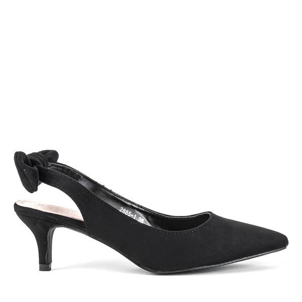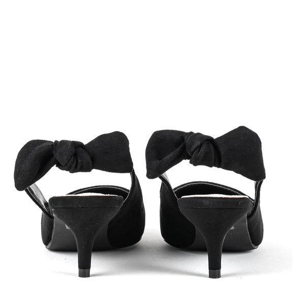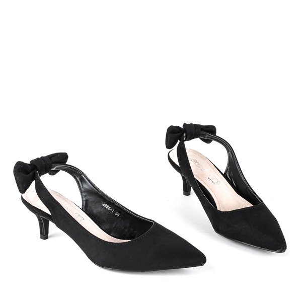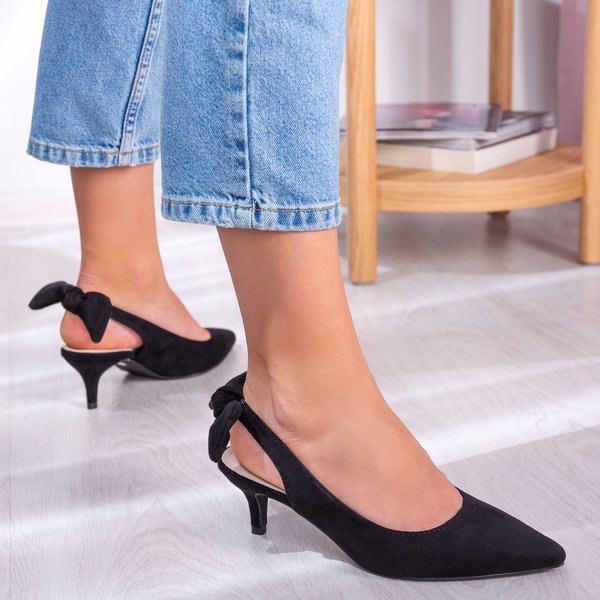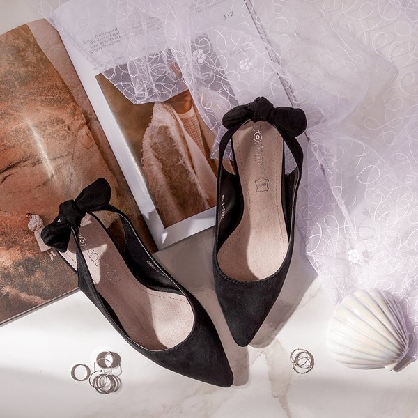 • Damskie sandały na niskiej szpilce ze szpiczastym noskiem. Wykonane z czarnej eko-zamszowej skóry. Wkładka ze skóry naturalnej. Pasek w tylnej części zdobiony kokardką. Prezentowane obuwie damskie będzie doskonałym dodatkiem do gustownych kreacji.