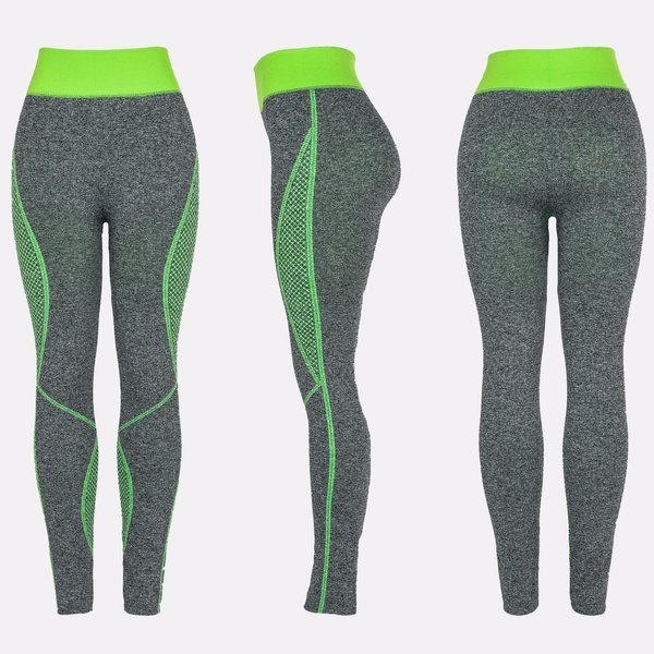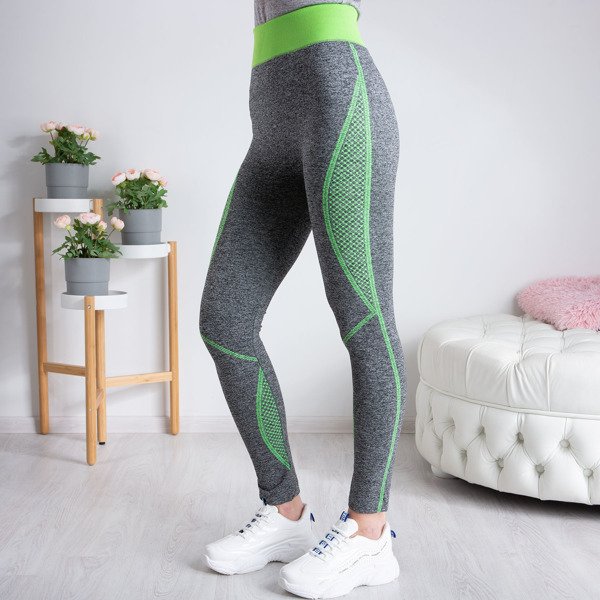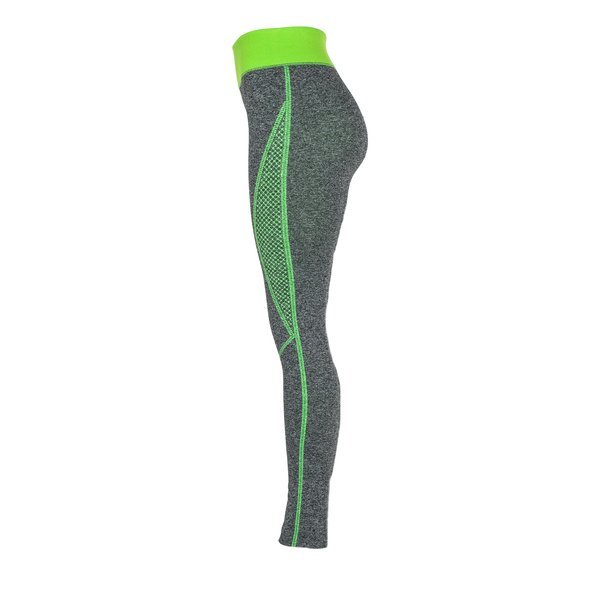 • Elastyczne getry wykonane z grubej tkaniny. Legginsy mają szary kolor i posiadają zielone wstawki. Prezentowana odzież może służyć jako sportowa bielizna pod odzież wierzchnią. UWAGA: Dokładność pomiaru (+/-) 1 cm.