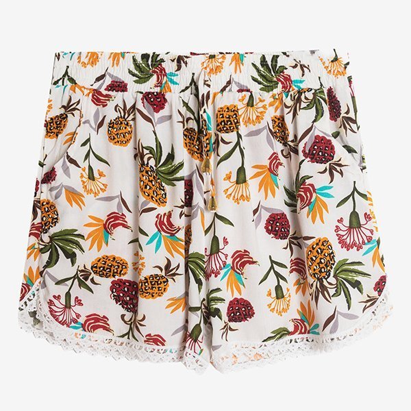 - Женские белые шорты с эластичным поясом. Брюки из тканевого материала, в нижней части декорированы кружевом. ПРИМЕЧАНИЕ: Точность измерения (+/-) 1 см.