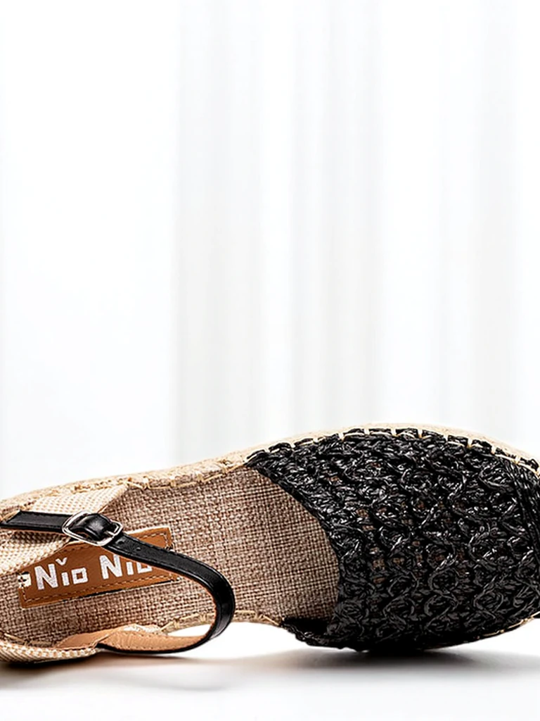 • женские черные эспадрильи на низкой платформе. Верх выполнен из пластика. Подошва декорирована плетеным джутовым шнуром по периметру. Модель застегивается на пряжку. Руководство по ткани. Идеально подходит для лета.