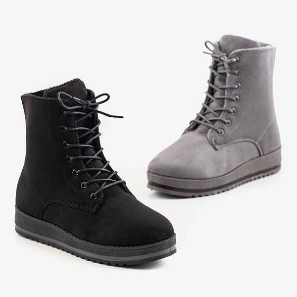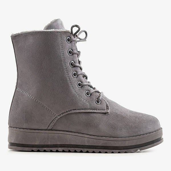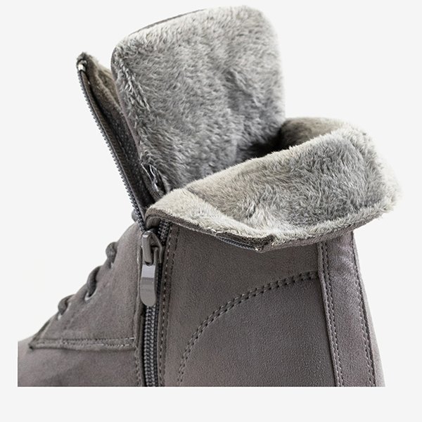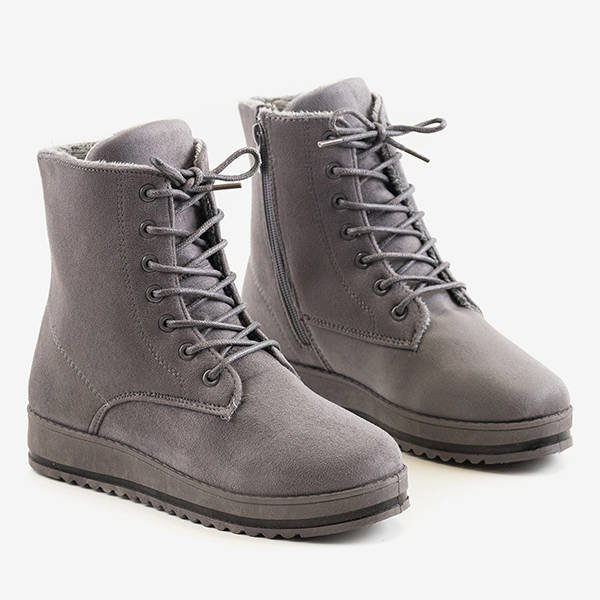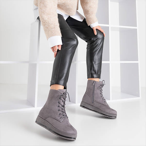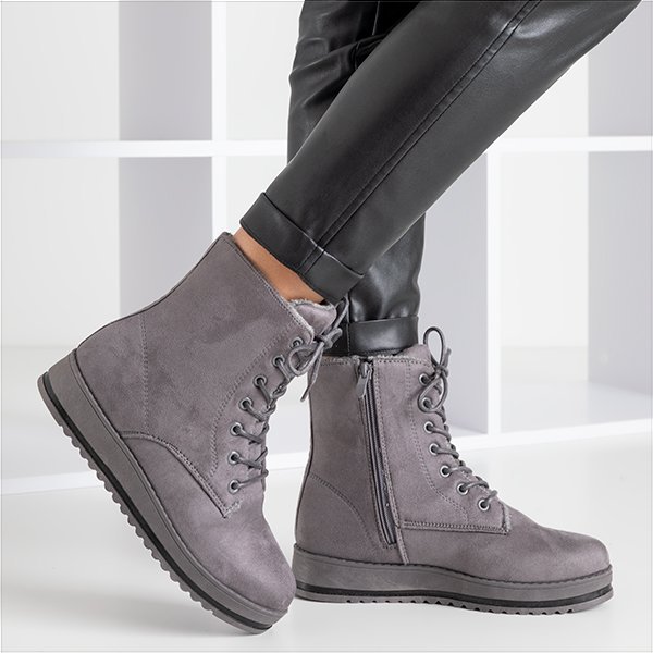 - Серые женские зимние сапоги на низкой платформе. Верх выполнен из эко-замши. Внутри изделие утепленное поролоном, покрытым мехом. Модель на шнуровке и с молнией сбоку. Идеально подходят для зимы.
