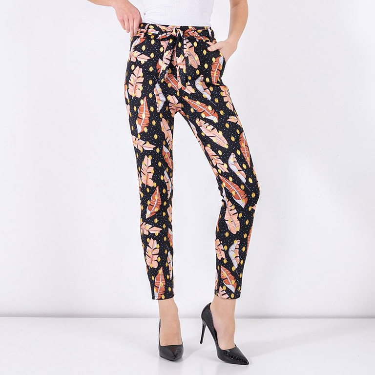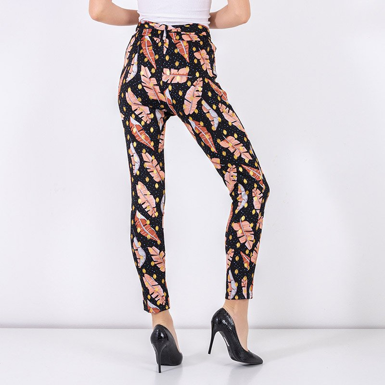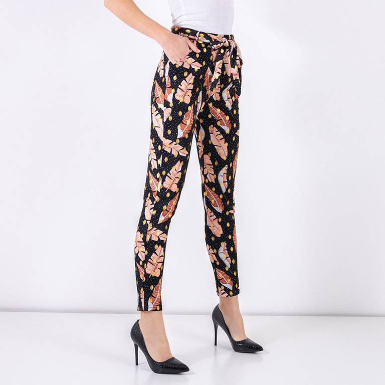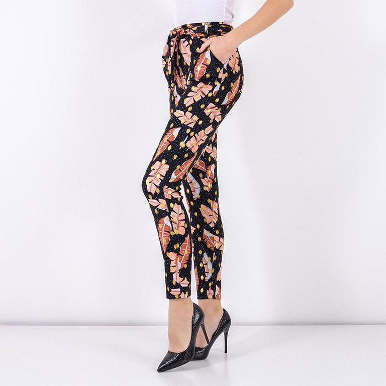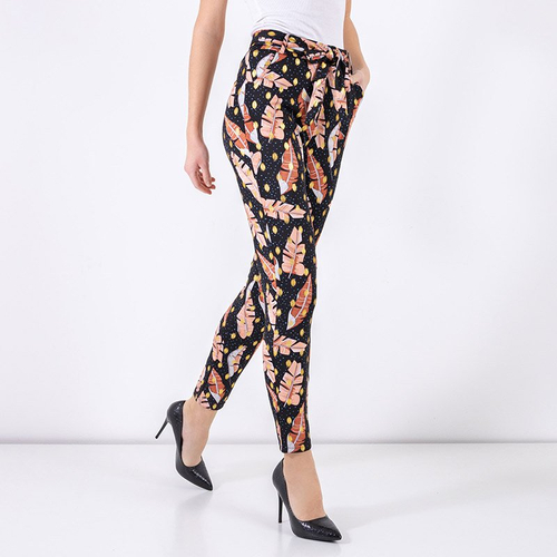 - Стильные женские брюки из эластичной ткани. Модель имеет эластичную резинку в поясе, два кармана и ремень соответствующего цвета. Брюки украшены принтом в виде перьев. Идеально будут подходить к Вашей рубашке! ПРИМЕЧАНИЕ: Точность измерения (+/-) 1 см.