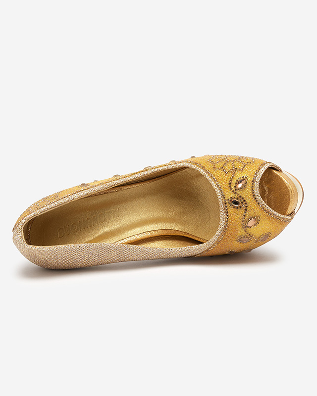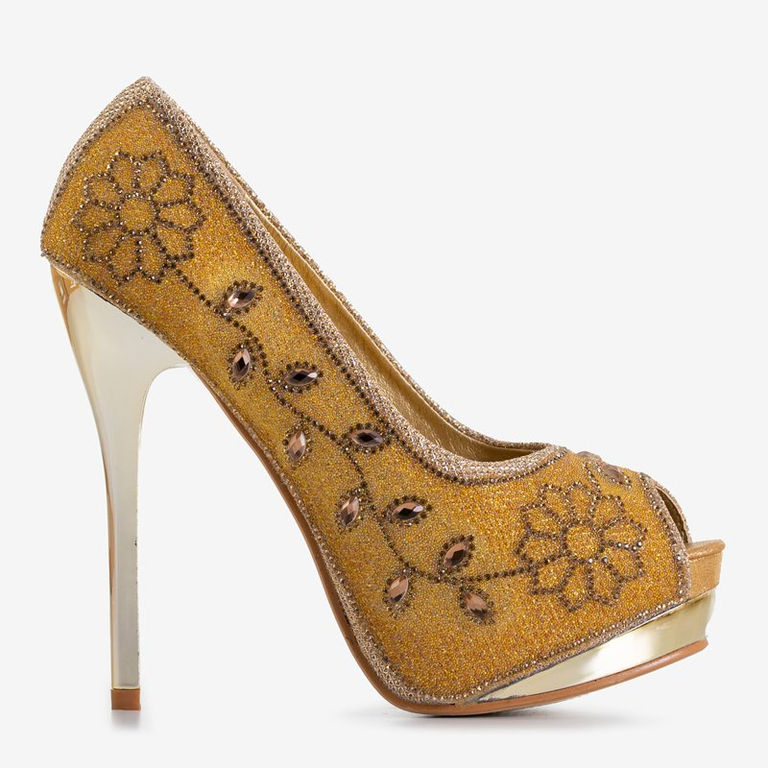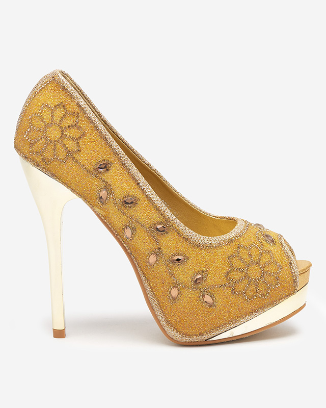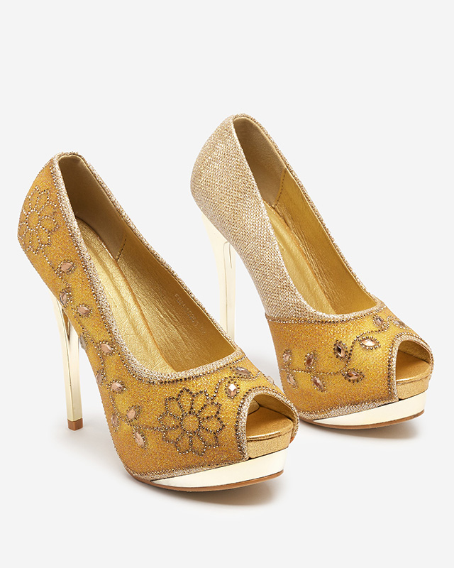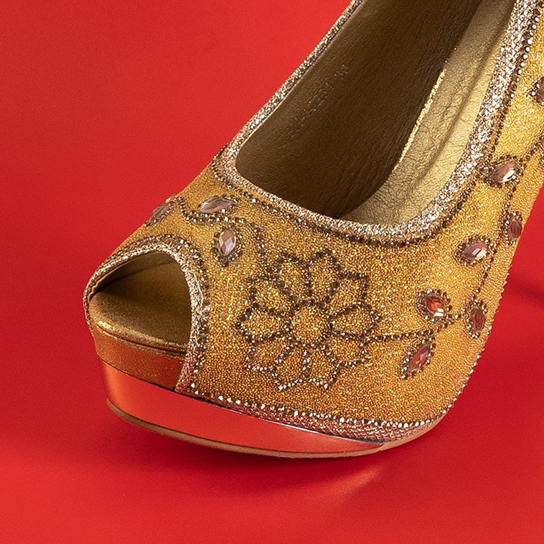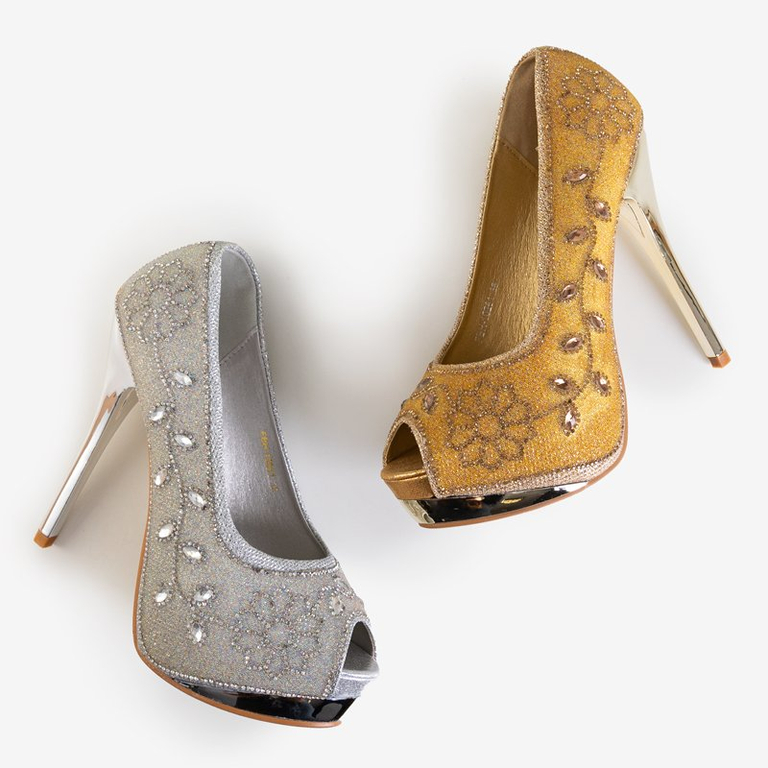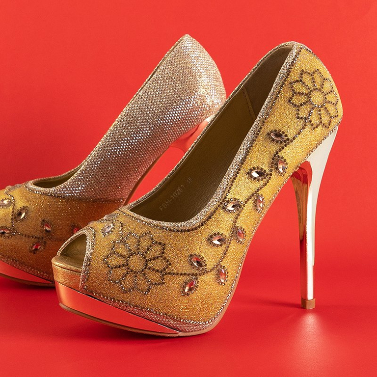 - Женские туфли на шпильке, украшенные стразами. Модель выполнена из сочетания тканевого материала и эко-кожи, покрытой блестками. Открытый носок. Внутри стелька с экологической кожи. Обувь, которая притягивает взгляд!