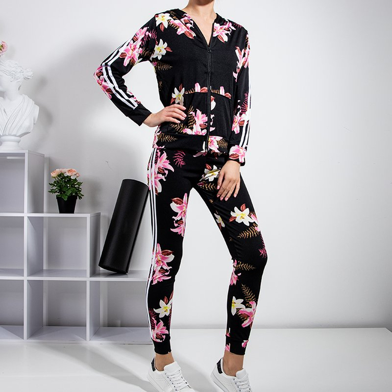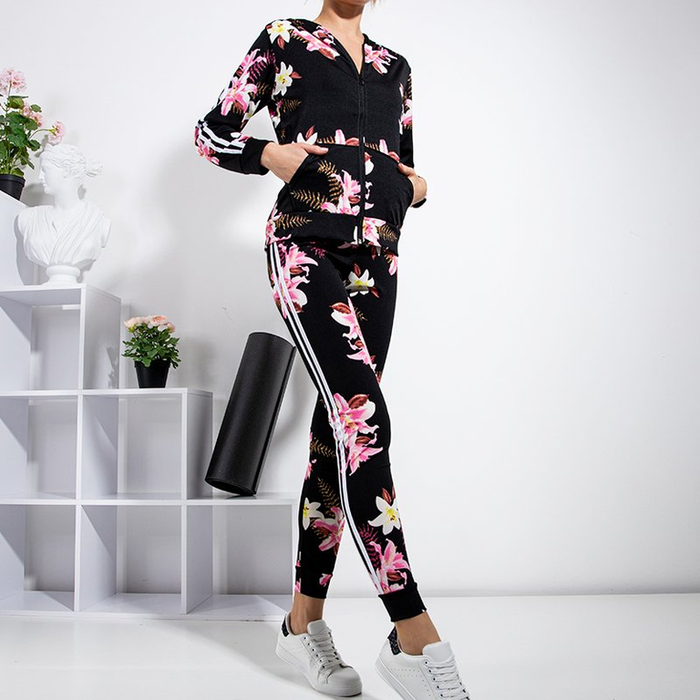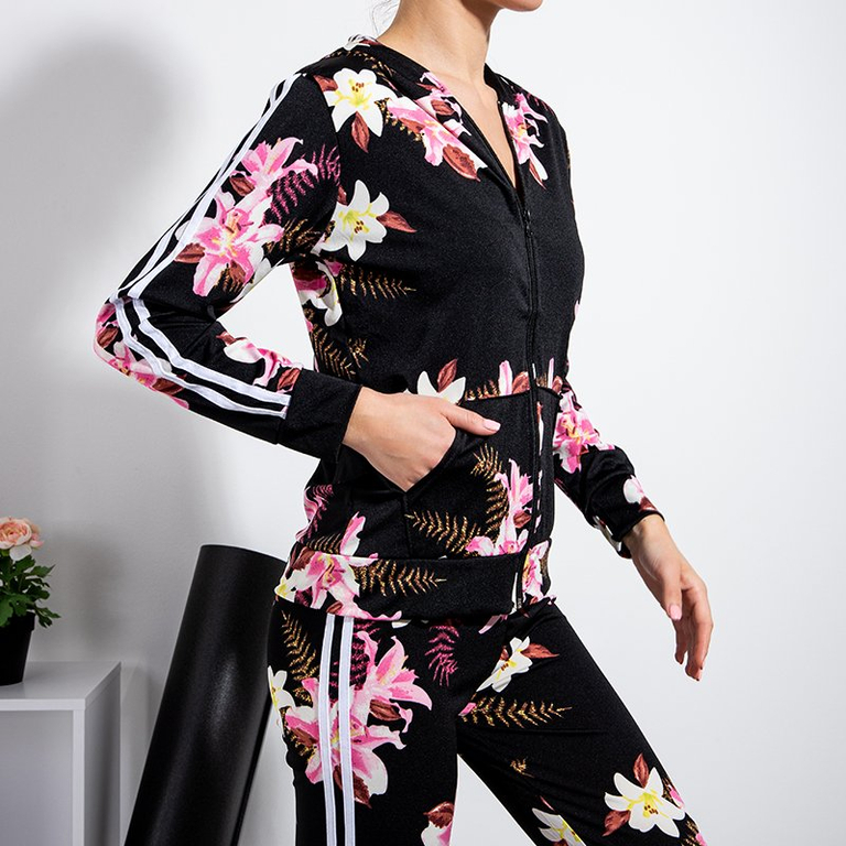 • Женский спортивный комплект из эластичной ткани, украшенный полосками и цветочным узором. Свитшот с длинными рукавами, на молнии, имеет карманы и капюшон. Брюки с эластичным поясом и штанинами. ПРИМЕЧАНИЕ: Точность измерения (+/-) 1 см.