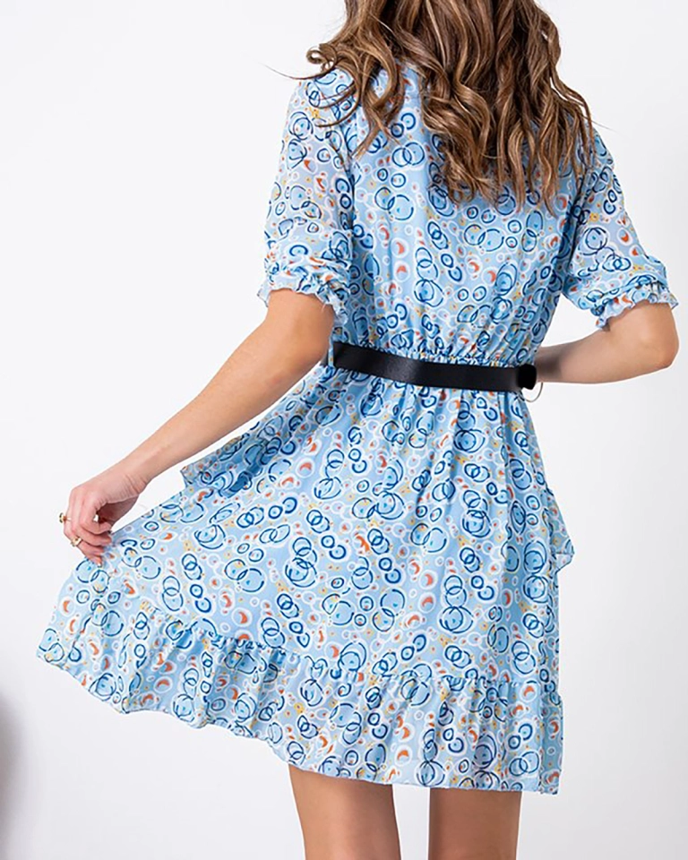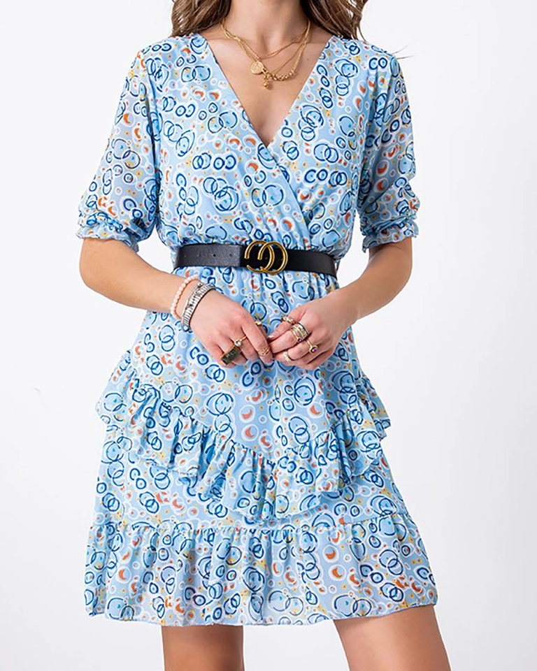 • Стильное женское платье, длины мини. Изготовлена из легкой ткани с цветочным узорами. Модель с декольте на запах и расклешенным низом, украшенным оборками. Рукава длиной 3/4. Ремень в комплекте.