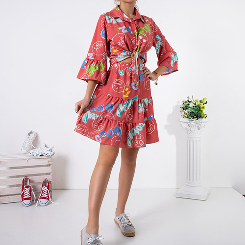 - Стильный женский комплект, украшенный цветным принтом. Короткая рубашка, застегивается на пуговицы и завязывается внизу. Рукав, обработанный оборкой, длиной 3/4. Юбка-трапеция имеет эластичную резинку в поясе.