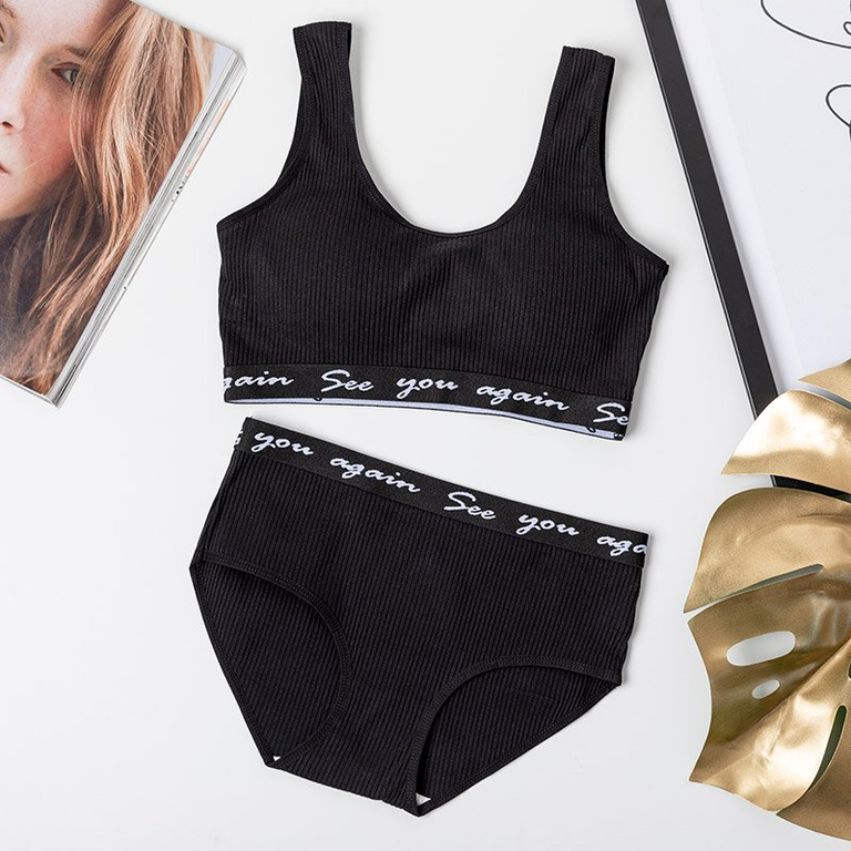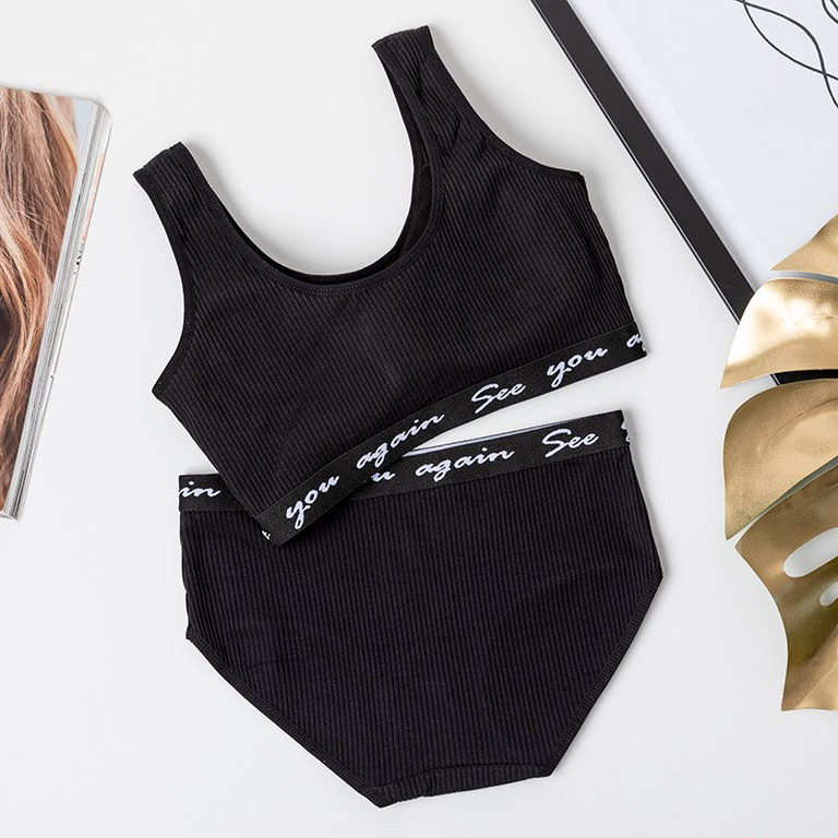 - Женское нижнее белье в спортивном стиле. Изготовлено из полиамида. Бюстгальтер на широких, нерегулируемых бретелях, мягкий, без косточек. Трусы с широкой эластичной резинкой в поясе. Модель украшена надписями.