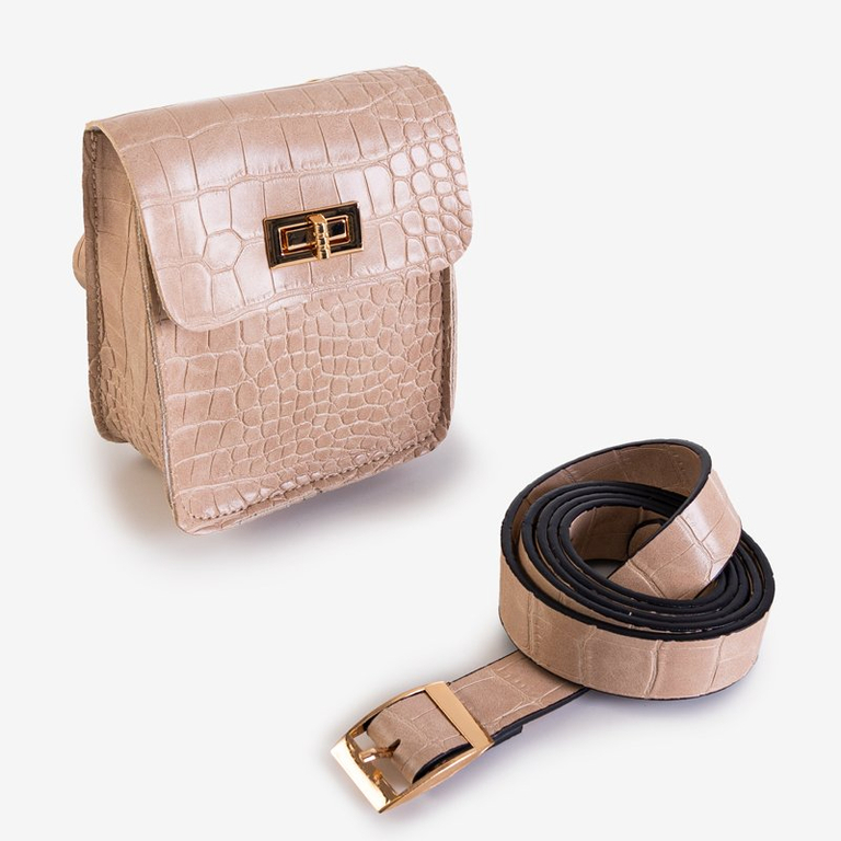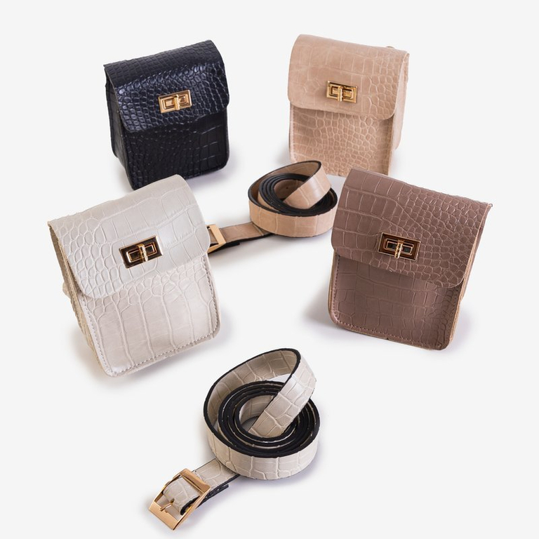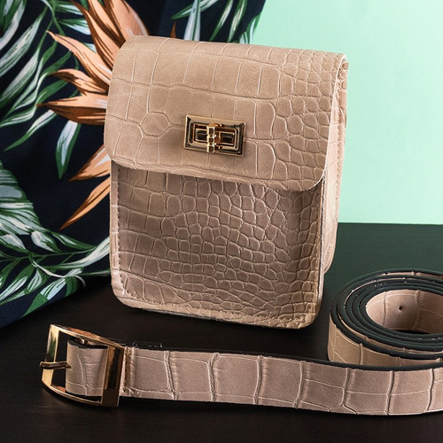- Женская сумка-кимоно, носимая на талии. Материал изготовления - эко-кожа, отделанная тиснением. Модель застегивается на поворотную кнопку.