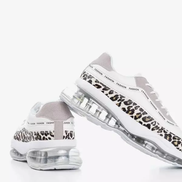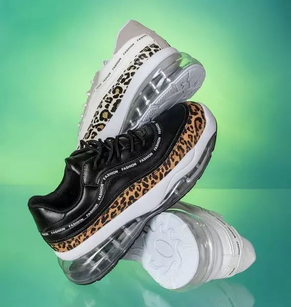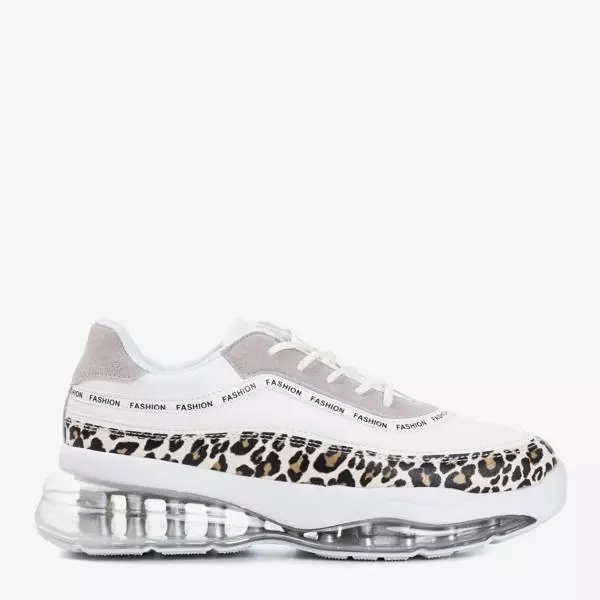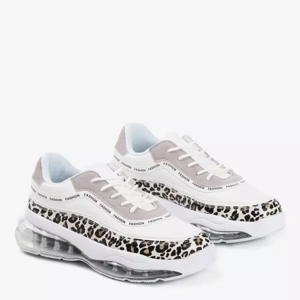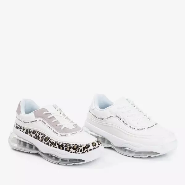 - Оригинальная женская спортивная обувь на прозрачной подошве. Модель из экологической кожи белого цвета со вставками из леопарда и эко-замши. Внутренняя подкладка из ткани. Туфли на шнуровке. Примечание: подошвы поцарапаны