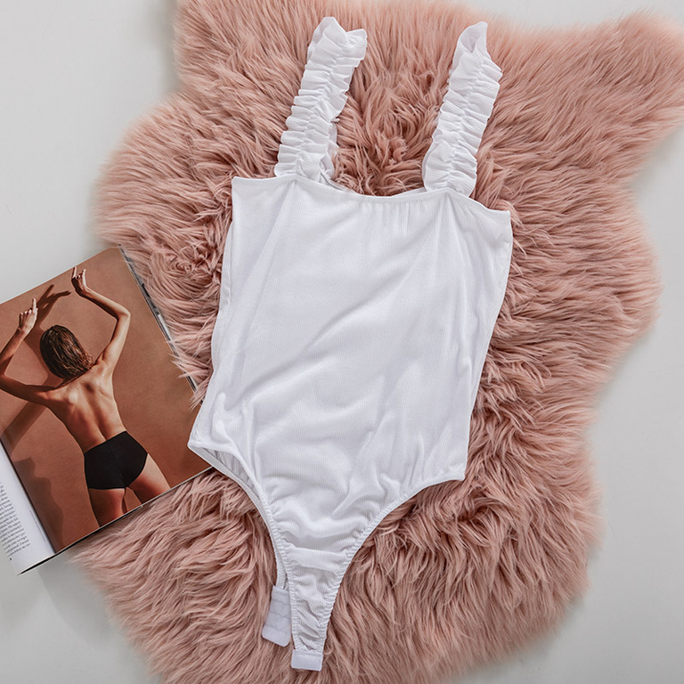 - Трендовая женское боди изготовлено из эластичной ткани в рубчик. Модель на оригинальных бретельках, украшенных оборками. Внизу боди застегивается на крючки. Идеальная база для повседневных образов!
