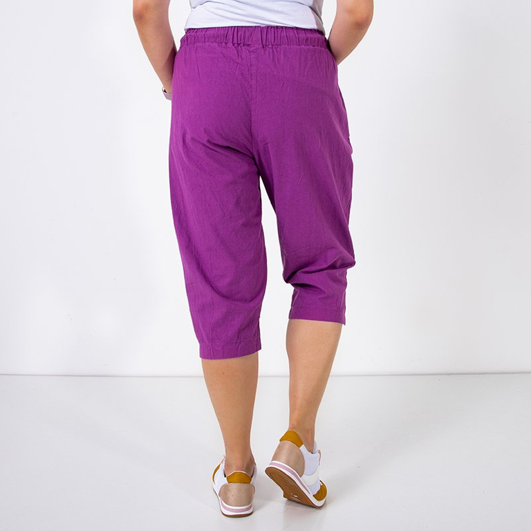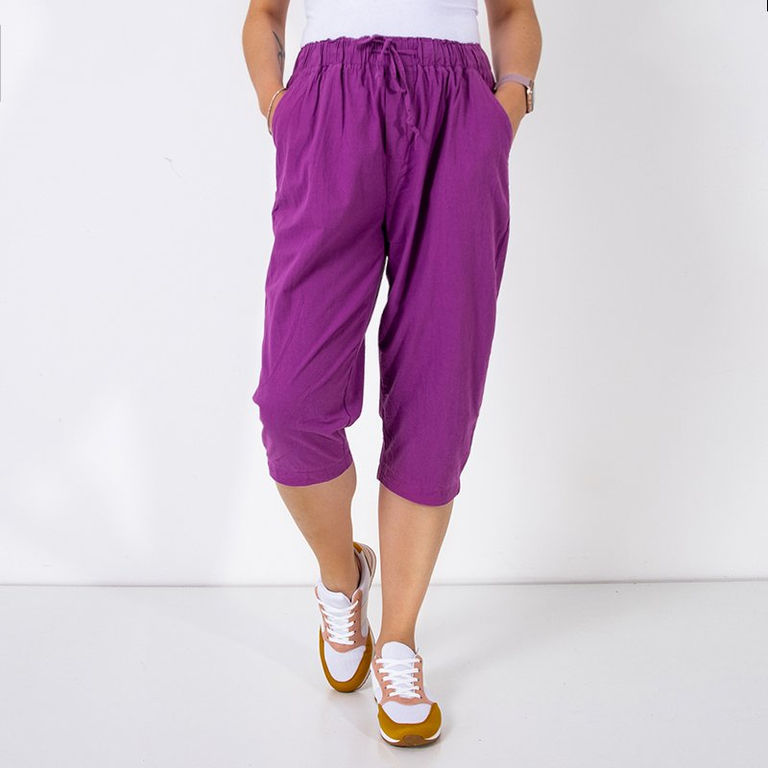 - Очень удобные женские бриджи. Изготовленные из легкой тонкой ткани. Модель с эластичной резинкой в поясе на завязках и двумя карманами по бокам. Идеально подходит для жарких летних дней!