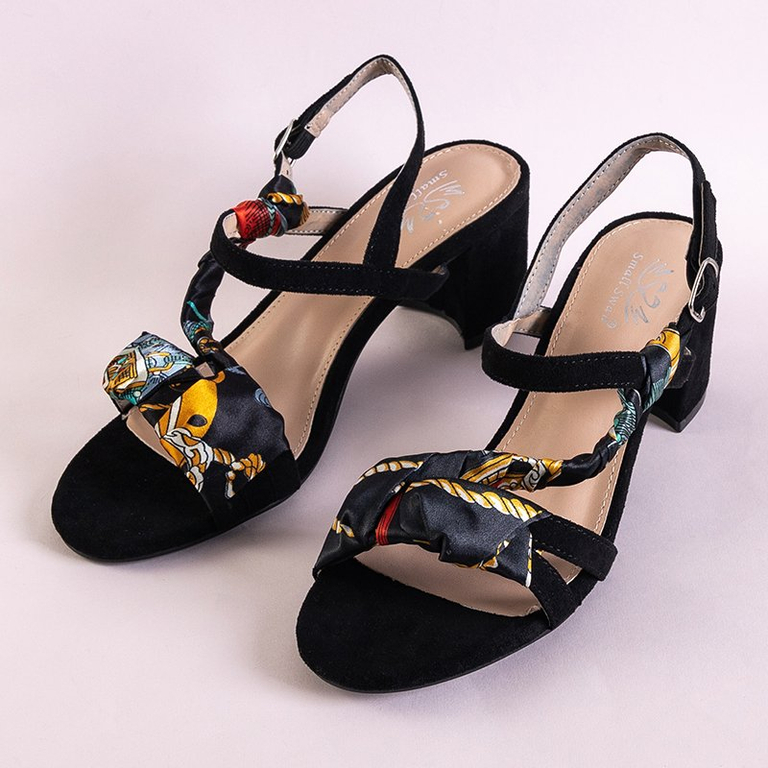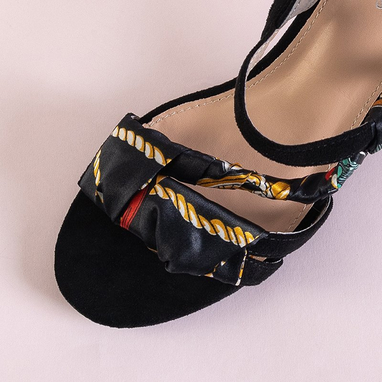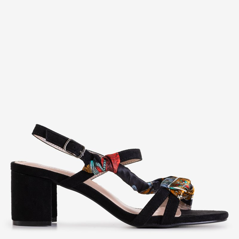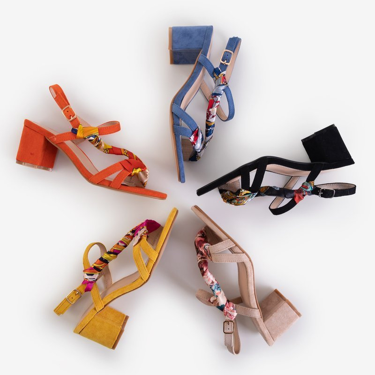 - Элегантные женские босоножки на устойчивых каблуках. Выполнены из эко-замши. Модель украшена цветной тканью. Застегивается на пряжку. Стелька обшита экологической кожей. Обувь, которая подчеркнет Вашу женственность!