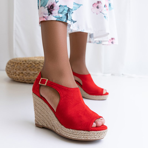 • Модные женские босоножки на танкетке. Изготовленные из экологической замши. Модель застегивается на пряжку с внешней стороны. Стелька обшита экокожей. Подошва украшена джутовой нитью. По бокам декоративные вырезы. Идеальная летняя обувь!