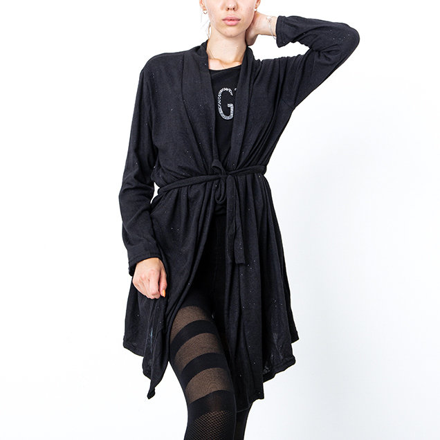 - Комфортный женский кардиган с мерцающим покрытием. Выполнен из вискозного материала. Свитер имеет пояс соответствующего цвета. Идеальная база для многих повседневных нарядов!