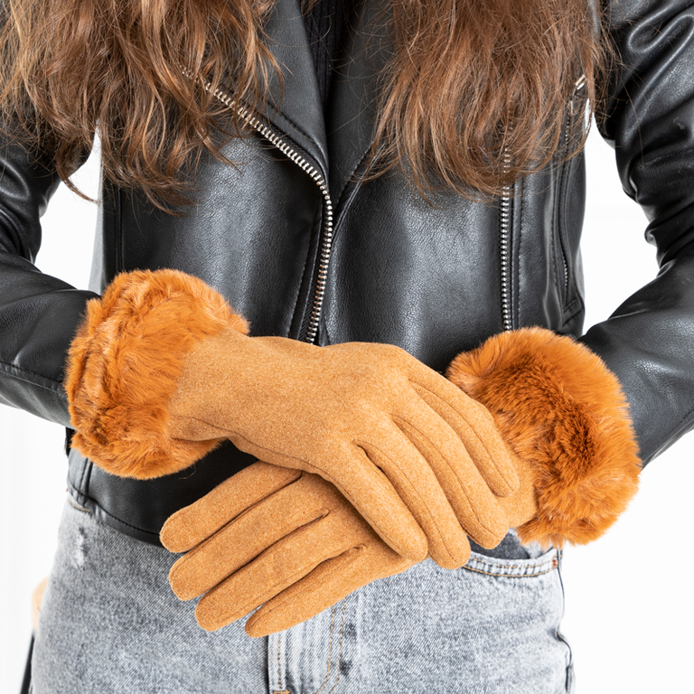 - Классические женские перчатки с мехом. Выполнены из ткани. Модель утеплена мягким, тонким мехом. На кончиках пальцев элементы, которые позволяют пользоваться телефоном, не снимая перчаток.