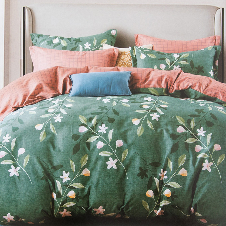Зеленое хлопковое постельное белье с цветами 160х200, комплект из 3-х частей