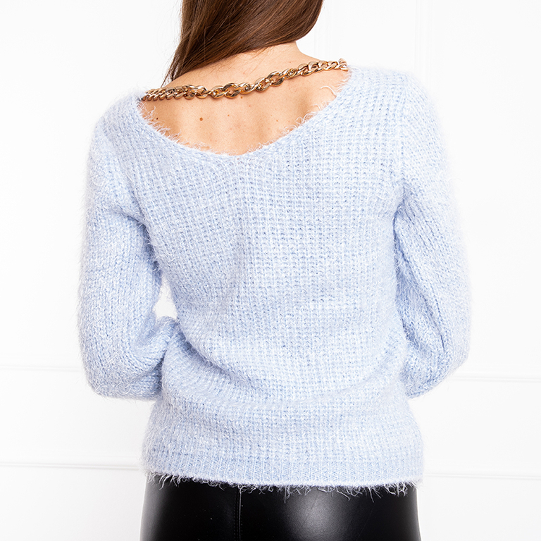 - Модный женский свитер из акрилового материала. Модель с V-образным декольте. Сзади свитер украшен цепочкой, который добавляет стильности.
