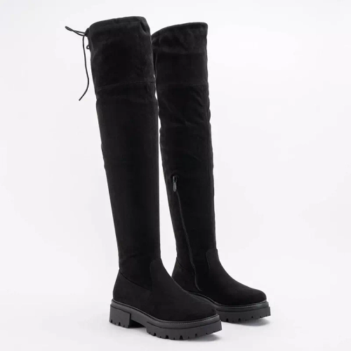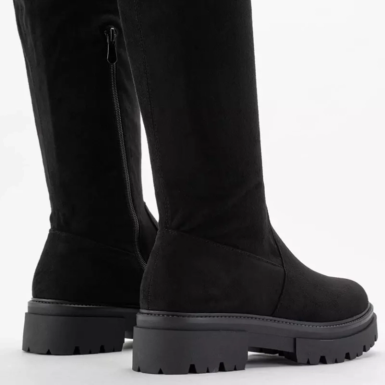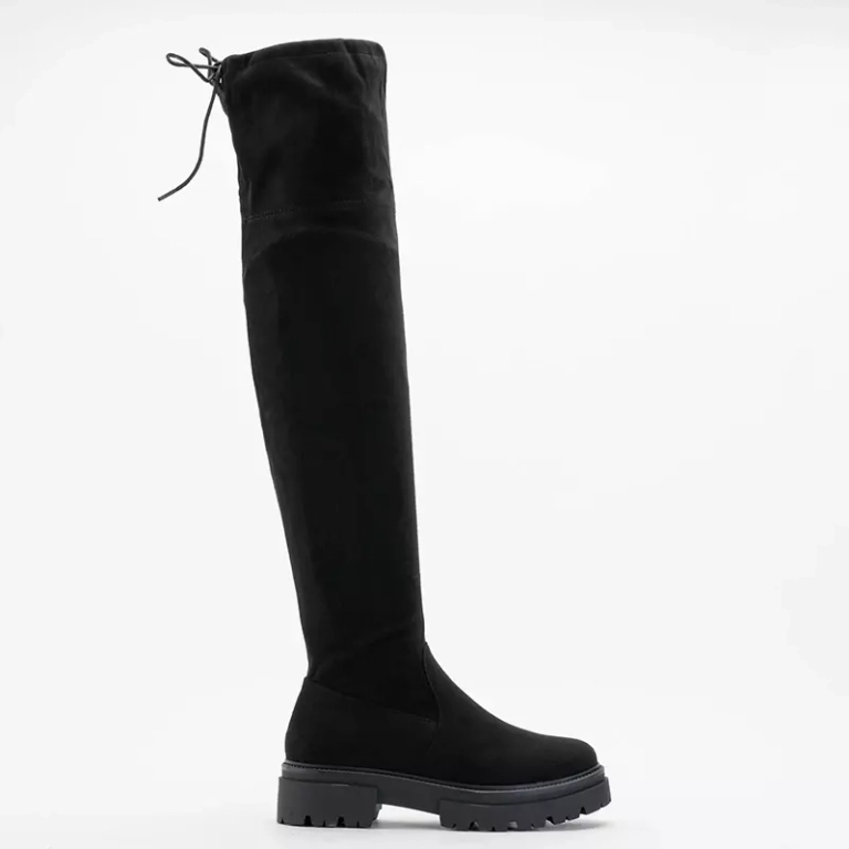 - Черные ботфорты из эко-замши на плоской подошве. Верх перевязывается сверху шнурком. Утепленная модель, застегивается на молнию до середины икры. Примечание: изделие имеет царапины на материале.