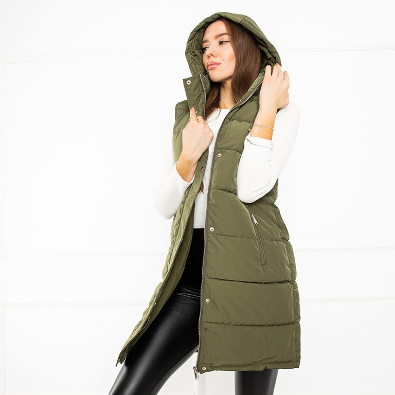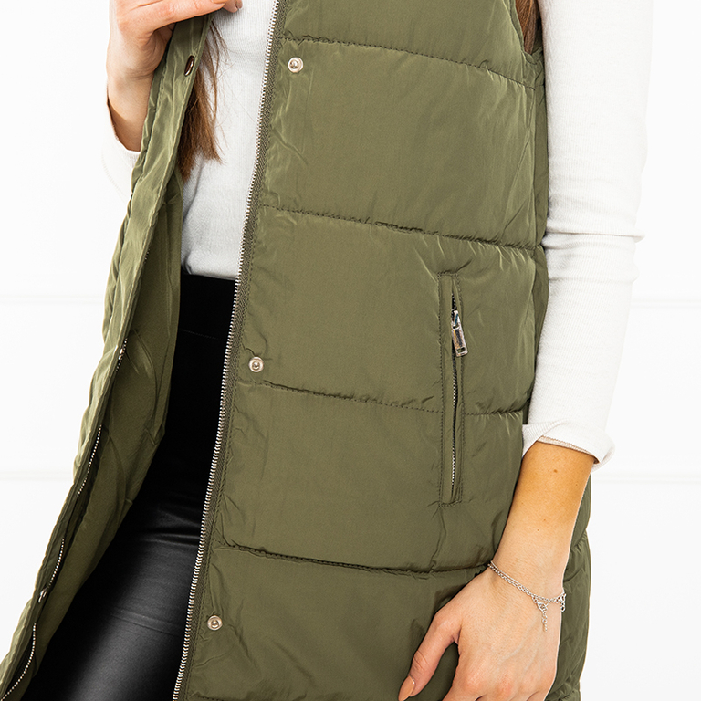 • Удлиненный женский жилет со стеганной отделкой – идеален для осеннего сезона. Модель застегивается на молнию и кнопки.