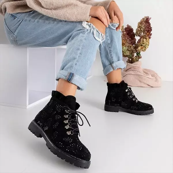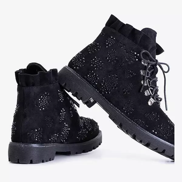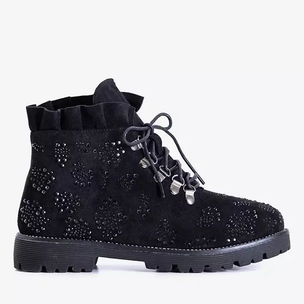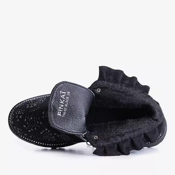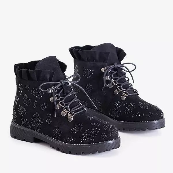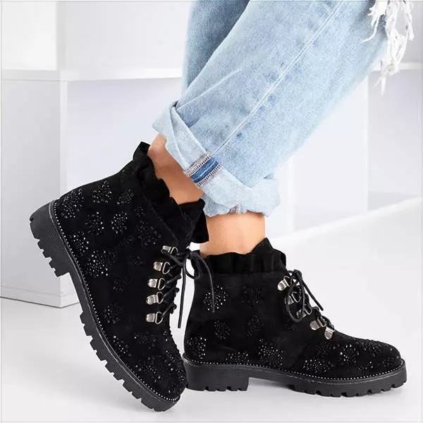 - Женские туфли на плоском каблуке из эко-замши. Верх украшен черными цирконами, верхняя часть имеет оборку. Примечание: изделие имеет следы клея на материале.