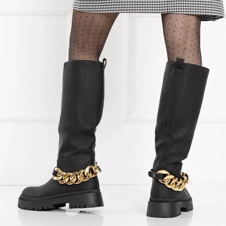 - Женские полусапоги из экологической кожи. Слипоны и частично застегиваются на молнию. Модель на плоском каблуке с декоративной толстой цепочкой сверху. Примечание: на изделии отсутствуют некоторые украшения.