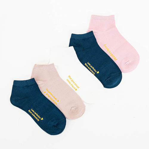 - Набор из пяти пар женских однотонных носков с золотыми надписями. Изготовлены из материала с высоким содержанием хлопка.