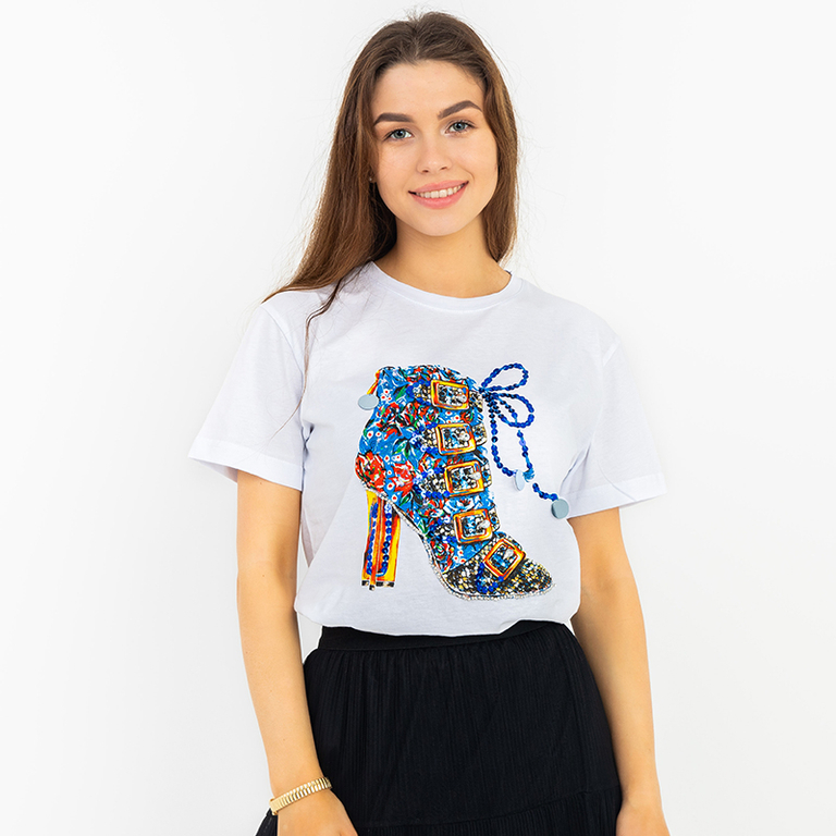 - Единственная в своем роде женская футболка с короткими рукавами и круглым вырезом. Украшенная элегантным принтом обувь с блестящими пайетками и фианитами. Прекрасный выбор для уверенной женщины! ПРИМЕЧАНИЕ: Точность измерения (+/-) 1 см.