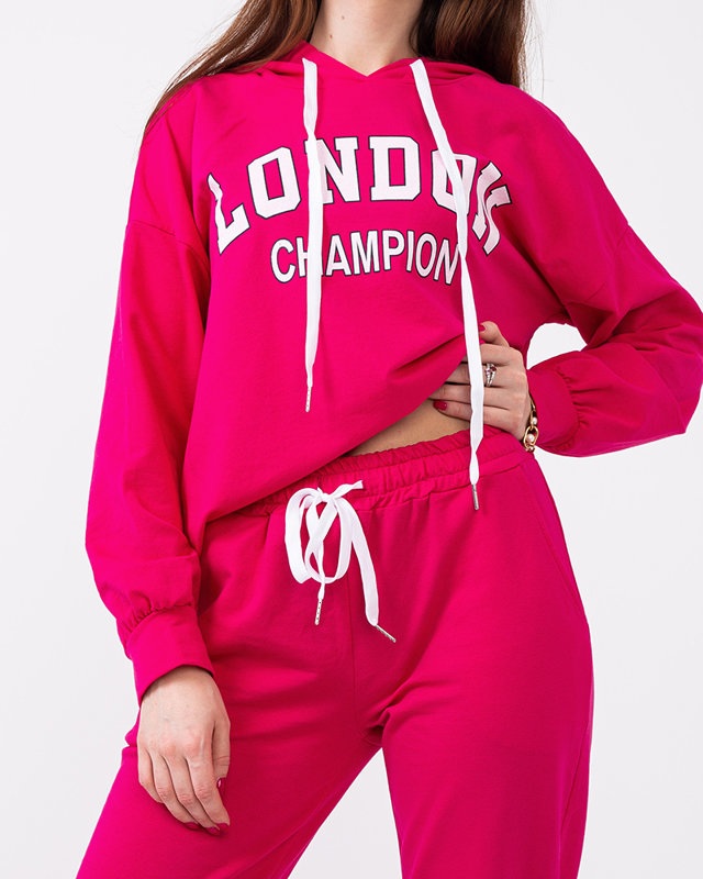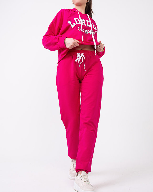 - Стильный женский спортивный костюм – брюки и худые. Модель изготовлена из материала с высоким содержанием хлопка. Худи украшенные надписью, брюки с эластичной резинкой в поясе, манжетами и 2 карманами.