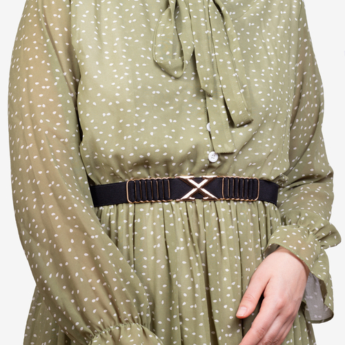 Уникальный женский ремень с металлической отделкой. Застегивается сзади на крючок. Модель сделана из комбинации эластичной резинки и металла. Идеально подчеркивает любой образ!