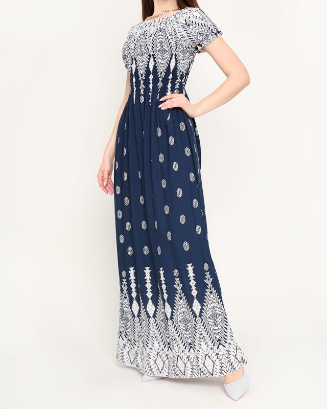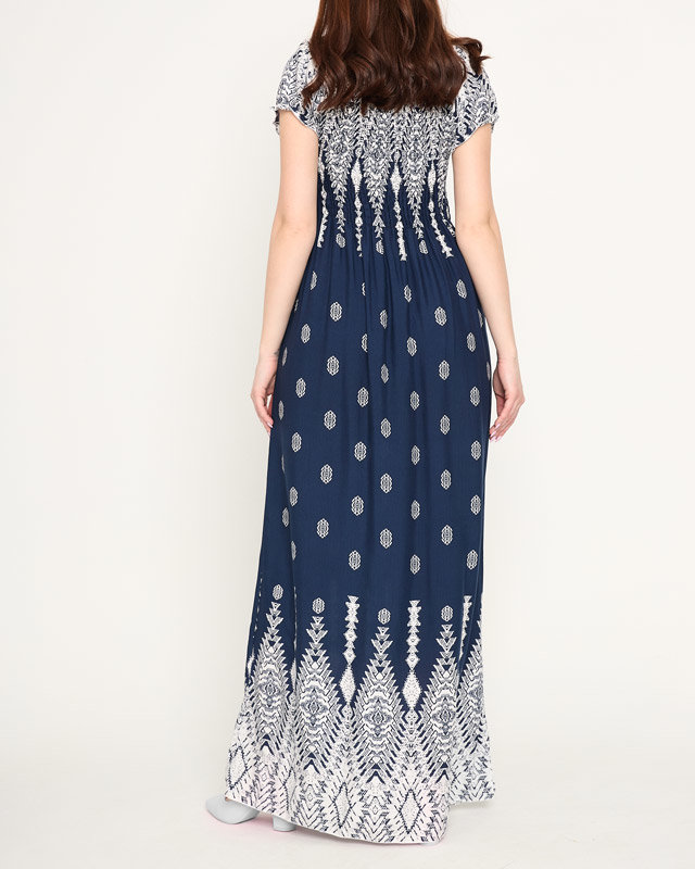 - Женское макси платье. Изготовлен из легкой и воздушной ткани. Модель украшена интересным узором, имеет короткие рукава, верх платья с резинкой. ПРИМЕЧАНИЕ: Точность измерения (+/-) 1 см.