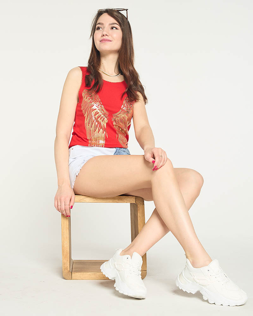 - Топ на бретелях из эластичного материала. Золотой принт спереди - крылья. Круглый вырез. ПРИМЕЧАНИЕ: Точность измерения (+/-) 1 см.