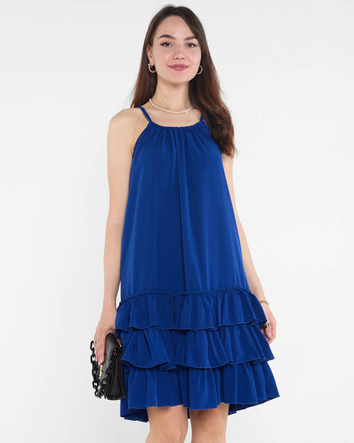 Темно-синее платье на бретелях с оборками