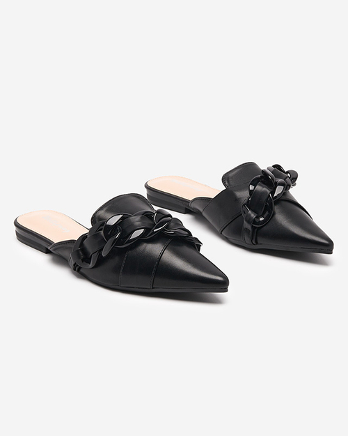 - Уникальные шлепки балетки, верх и стелька которых изготовлены из эко-кожи. Шарму обуви добавляют пластиковый орнамент и острый носок.