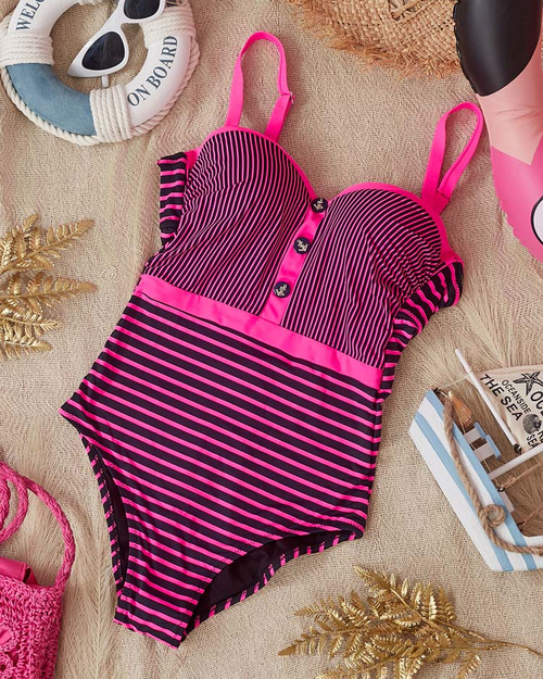 • Фантастический женский полосатый купальник, украшенный пуговицами. Модель с усиленными чашечками и пуш-апом, завязками на спине и регулируемыми бретелями. Я должен быть в твоем чемодане во время отпуска! ПРИМЕЧАНИЕ: Точность измерения (+/-) 1 см.