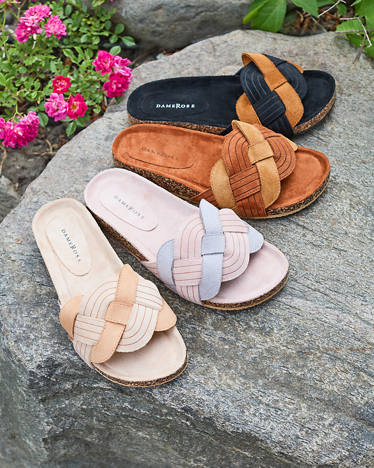 • Красивые женские шлепанцы из эко-замши. У них декоративный плетеный верх. Резиновая подошва украшена материалом а'ля пробка. Они прекрасно дополнят летний образ!